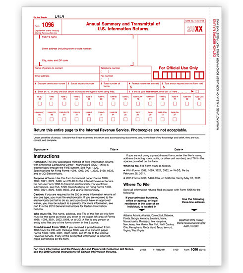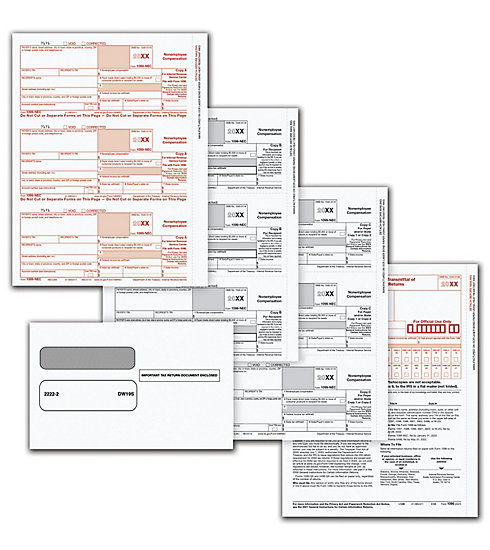 Set includes 1099 forms, corresponding self-seal envelopes, and two copies of the 1096 form.