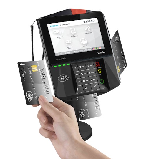 The payment devices include a card reader, signature pad, and PIN Pad.