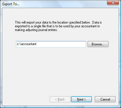 This feature allows the user to export his data so he can send it to an accountant or consultant. The export process creates a zipped file that is secured with a password. The accountant is required to install the EBMS software on his network in order to read the zipped data file. Review the Accountants Use of the Journal section for instructions for the accountant.
