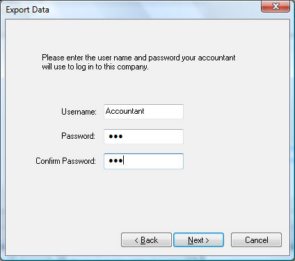 NOTE: Communicate the user name and password to the accountant since he must enter this information to access the data.