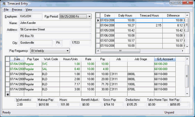Scenario: Labor is an important asset within a building supply center that sells and manufactures building materials.  A payroll service is used to process payroll taxes and deductions.    The supply center tracks labor using EBMS time clocks to record the time spent within the sales, delivery, office, and manufacturing departments.   Some employees allocate their time to multiple departments when they clock out of the Time Track time clock.  The payroll service generates the employee pay via direct deposit with the exception of one employee.    This employee requires a printed check which is calculated and printed within EBMS.    Combining the power and details of an internal labor system with the convenience of a 3rd party payroll service allows this building supply center to maximize the effectiveness of their labor management.