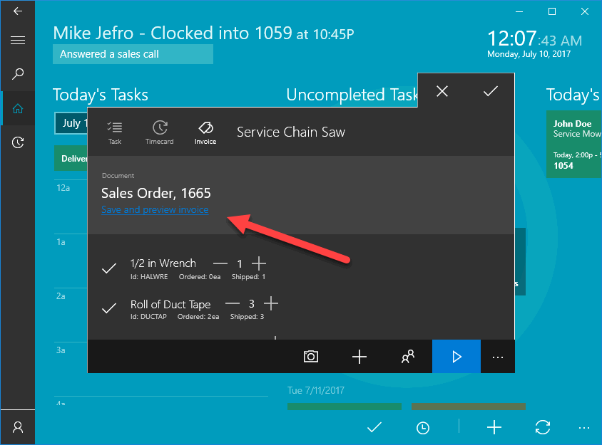 The MyTime app gives the user the ability to complete the task and process the invoice onsite. This tool includes the ability to preview the invoice with the time and labor, process a payment, and email a copy of the document to the worker.