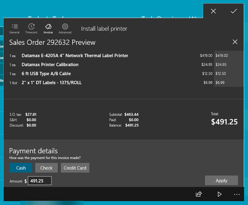 Enter the worker's payment information such as the Check or Credit Card number if applicable and tap Apply to post the payment to the attached sales order.