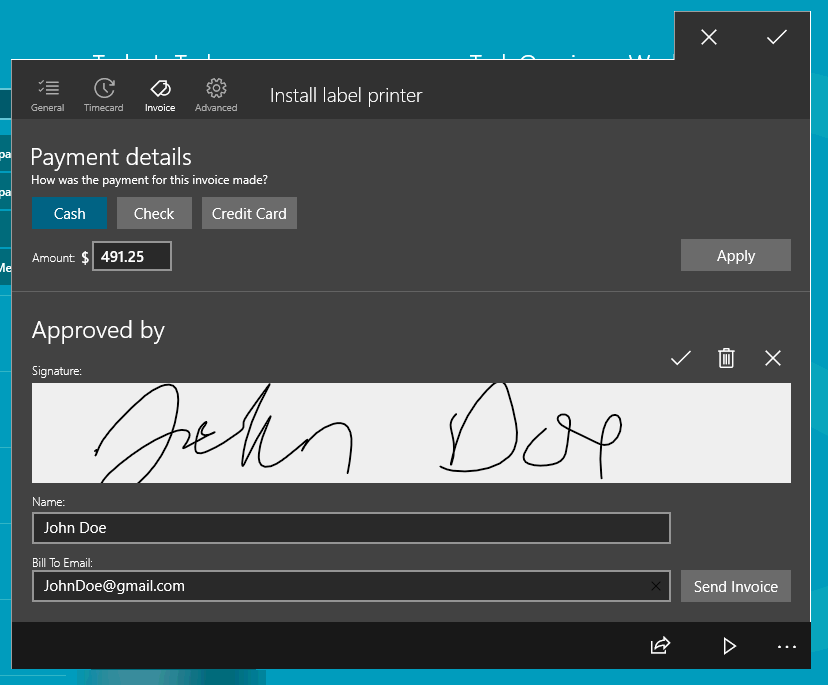 The invoice receipt can be sent to the worker by entering the worker's Bill To Email and tap on the Send Invoice button. The Send Invoice buttion will trigger EBMS to send a copy of the invoice to the customer from the office. The invoice and payment process is completed within EBMS and the document is sent from the server rather than MyTime. Contact your network administrator with any communication errors. Review [Sales] CRM > AutoSend Documents > Auto Sending Sales Orders or Invoices for details on sending sales invoices from EBMS using email.