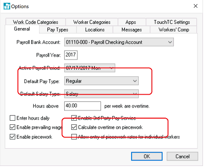 Enable the Calculate overtime on piecework if piecework pay is included for worker payments and overtime pay is desired for piecework pay.