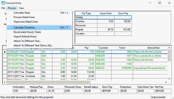 Overtime can be set manually by the user but most user launch the Process > Calculate Overtime utility from the timecard. Overtime is calculated within a timecard on an individual basis by completing the following steps: