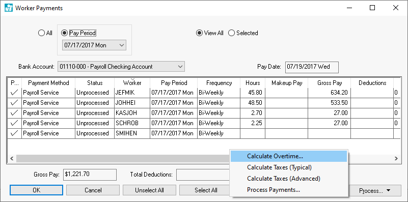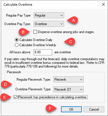 The Overtime Calculation utility will calculate hourly pay first and then calculate piecework pay unless the Piecework has precedence in calculating overtime option is enabled.