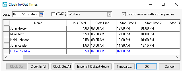 Clock in and clock out times can be manually set using a variety of electronic time clocks or by using the Clock In/Clock out employee list. This dialog can also be used to audit clock in/out times for all employees for a specific date.