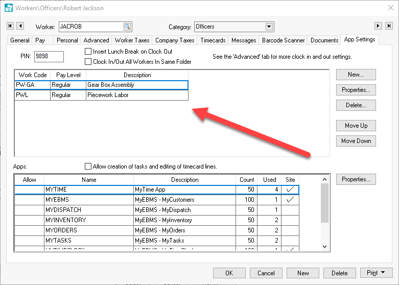 piecework work codes to the worker's app settings tab.