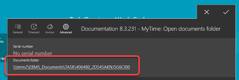MyTime users may wish to view or send documents, images, or other files from the MyTime tablet to EBMS. The task module within EBMS may contain a Documents tab to store various documents associated with the specific task or work order.