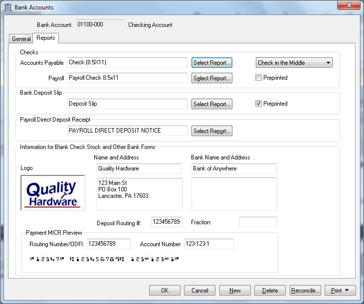 Review [Financials] Bank Accounts > Changing Bank Account Information for more details on the bank account reports settings.