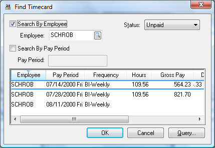 To select a timecard for a specific employee switch the Search by Employee option box and select the appropriate Employee by clicking on the search button to the right of the Employee field. Check the Search by Pay Period switch to limit the list to a specific Pay Period. Highlight the desired timecard and click OK.