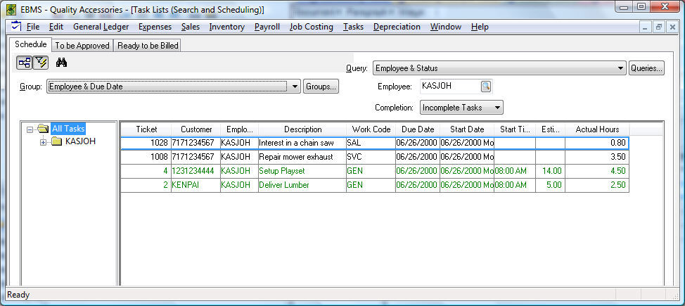 Folder groups will appear only if a task exists within that group or date. Note the No Due Date folder in the list above. This grouping is useful to identify tasks with no due date.  Create additional tab views if additional lists such as pending tasks, tasks that are on hold waiting for parts, or completed task are needed.  Open a task by double-clicking on the task. The Schedule entries are found within the Schedule tab of the task.