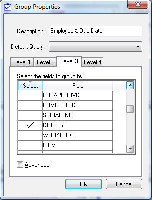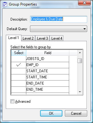 Check one or more of the options within the list to identify a field within the first level of the group. The selected field - EMP_ID in the example shown above, groups the first level of the task view by the employee id. Review the Standard Features > Advanced Query Options section in the Main documentation for details on identifying a field name.