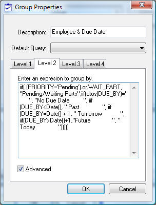 The Level 2 grouping option is using Advanced code to group the second level. The second level is not identified by a single field or two but is created using programming code as sown below. The Advanced option is enabled to change the grouping option from a field list to programming code. This code is similar to the advanced query code explained in the Standard Features > Advanced Query Options section of the main manual.