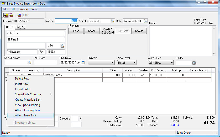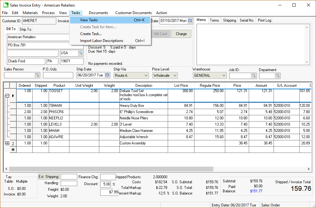 Enter the service item into a sales order as shown below. The system will prompt the user to create tasks when the invoice is saved. Click File > Save to activate the create task dialog. The dialog will not appear if the task is not attached to the service item or if the service item was entered previously and the dialog was canceled.
