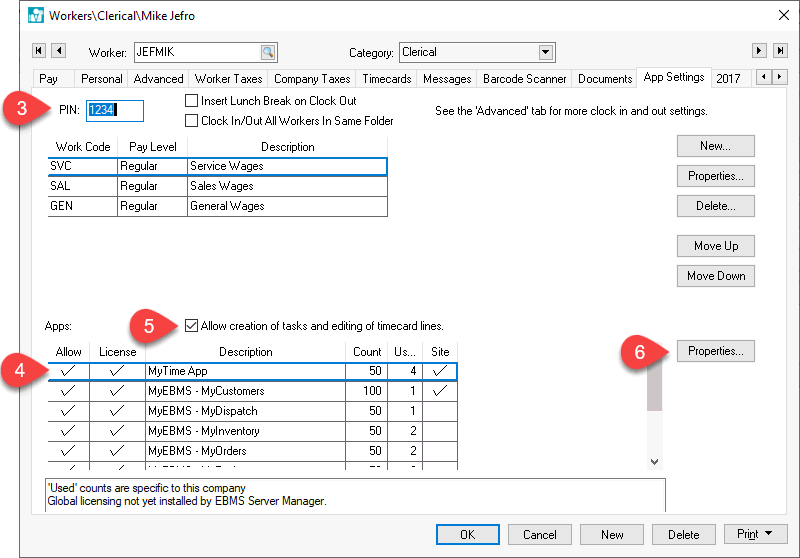 The MyTime app requires the user to configure the PIN code, display options, and other MyTime settings with the App Settings tab of the worker record within EBMS. Complete the following steps to configure the MyTime settings for each user: