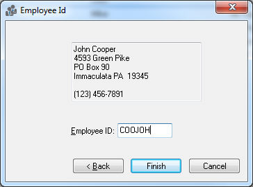 Enter the Worker Id code. This code is required to be unique to a specific worker. This Id is used throughout the entire accounting system for all transactions associated with this worker. (Changing the worker Id is a lengthy process – plan and use an Id that is satisfactory). Click Finish to create a new worker or Cancel to ignore new entries.