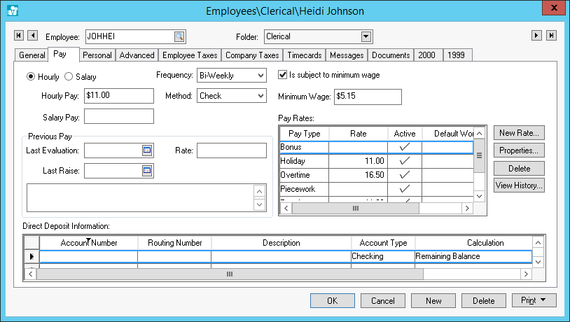 Enter a new employee record within Payroll > Employees if the employee record has not been created. Select Edit > New from the employee list or click New within the employee window to create a new employee record the same way other employee records are created. Review the Workers > Entering New Workers section for detailed instructions on how to create a new employee record.