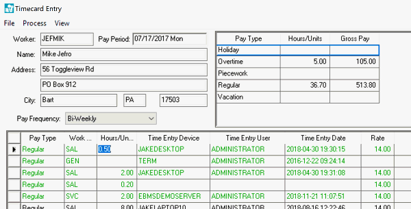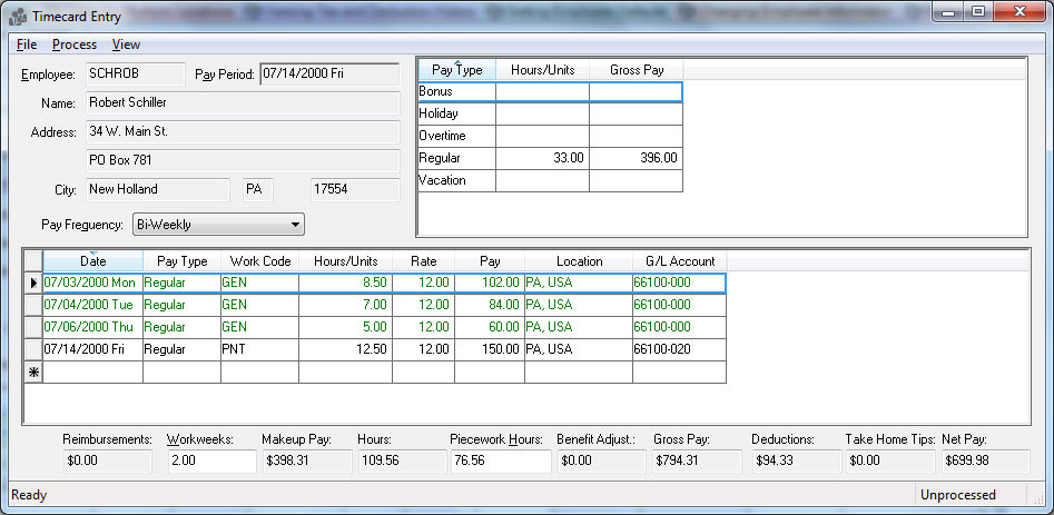 The timecard window is the main window used to enter employee’s time. Hourly time, daily hours, piecework, commissions, tips and other types of pay are all entered into this window. An employee can only have one timecard per pay period. This screen can also be used to view processed timecards and the taxes withheld from the wages. A pay period must be established before any timecards can be entered.