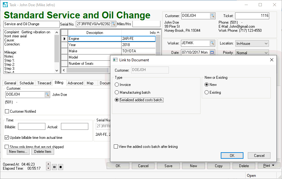 The following process will attach a task or work order to the added costs of a serialized item instead of billing a worker. Complete the following steps to add the labor costs and parts to the original cost of the serialized item: