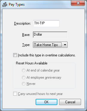 The Type option should be set to Employer Paid Tips if the tip is included within the employees’ paycheck. The Take Home Tips option should be used if the cash tips were given to the employee but must be added to the gross pay for tax calculations. Create both pay types if employees are paid using both tips methods.
