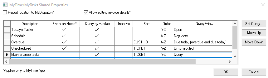 Some of the settings such as Report location to MyDispatch*, Allow editing invoice details*, Show on Home, and Group settings apply only to MyTime and do not apply to MyTasks. MyTask will always report location to MyDispatch so the option has no affect in MyTask like MyTime.