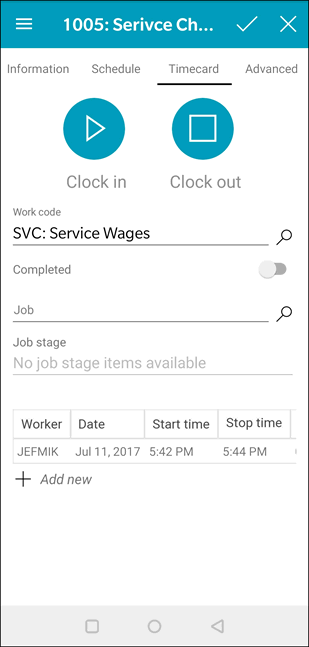 6. Set the Work code and optional Job id and Job stage before clocking out of the task or clocking into another task.