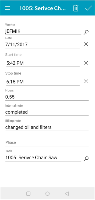 The MyTasks app can be used to add time to a task.  The task and work order system in EBMS can post time to a specific job, work code, or work order, and other time tracking tools in EBMS.  The Timecard page of MyTasks (C section below) is used to track the amount of time spent on the specific task.