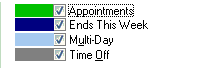 Tasks are scheduled in 4 different types identified using 4 different colors. The task schedule types are identified with the 4 colors. These color identifiers are located on the upper portion of the schedule view: