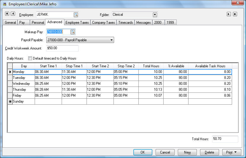 The available time in an employee's schedule must be recorded for each employee. The employee's normal work days, the normal daily hours, and the percent of the normal hours that can be scheduled must be entered for each employee. Review the Work Groups section to enter the available time for each work group.