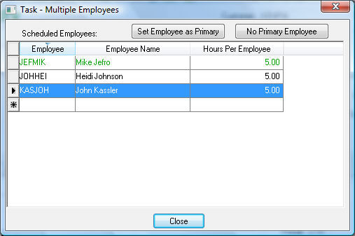 Multiple employees can be assigned to the same task or work order. This feature should only be used for a group of employees working in a task. Multiple tasks should be create when multiple employees are assigned a task that varies in responsibilities or schedules.