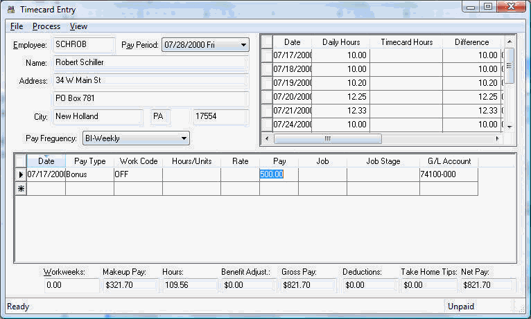 Enter the bonus pay within a new timecard as shown below: