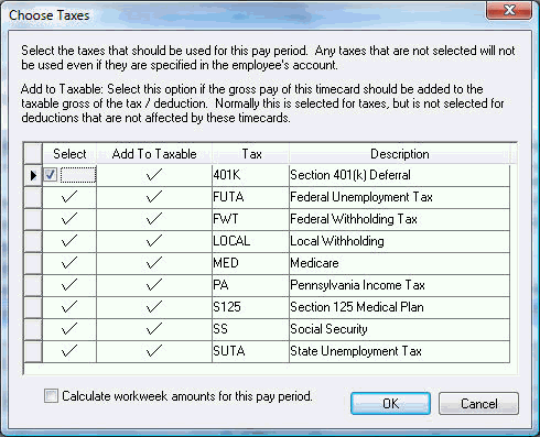 way the employee’s taxes and deductions are processed. The Select column identifies all the taxes and