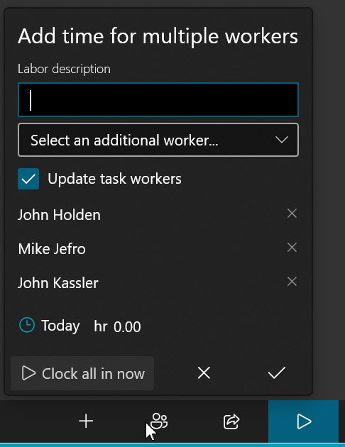 Enter a Labor description, add the users, and tap the Clock all in now.