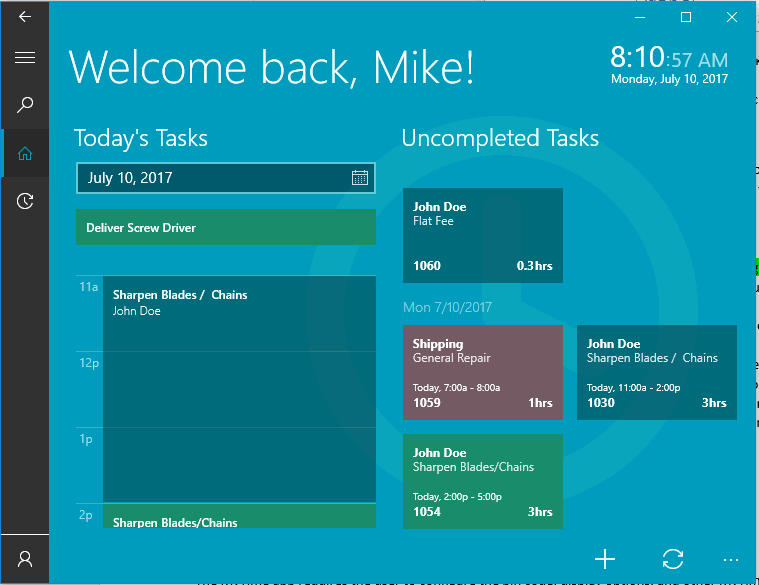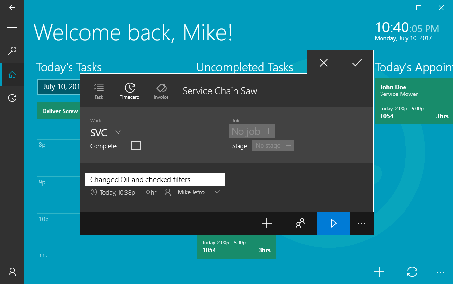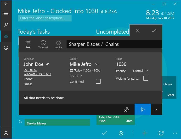 One of the challenges of a service company is to track the technician time required to complete an installation or service task. An important requirement of a time tracking device is to be convenient and accurate so the technician can focus on the task at hand. For example, a technician may need to record his labor for the following schedule: