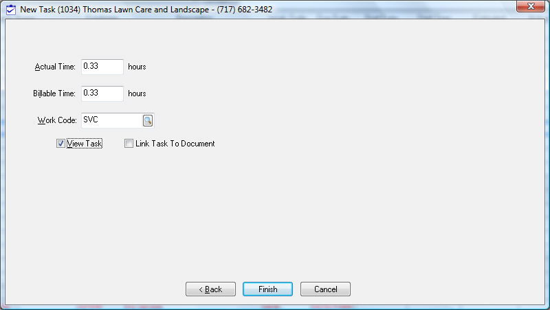Enter the Billable Time. The Work code should default to the code entered in the task type defaults. Review the Creating Task Types and Defaults section for more details on setting defaults.
