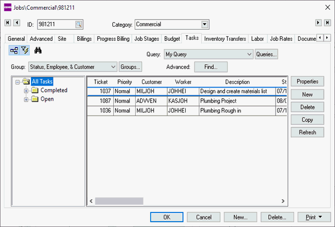 The task module can be an excellent enhancement to the optional job costing module. Tasks can be used to schedule and track labor within a construction or manufacturing job. Tasks can also be used to track labor within a job that manages a contract such as an annual service contract.
