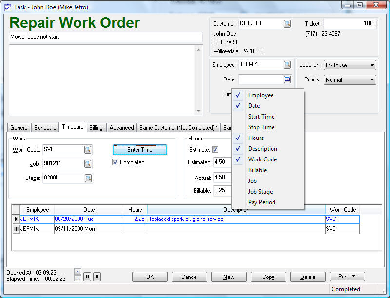 The Job and Stage can be set per employee time line by displaying the Job and Job Stage columns as shown above. Review the Recording Labor and Completing the Task section for more details on entering data.