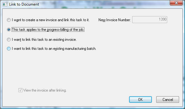 Billable time can be applied to a job rather than billed to a worker. The Select button on the General tab can be used to apply the time to a job. The This task applies to the progress-billing of the job option will only appear if a job is entered in the Time tab of the task.
