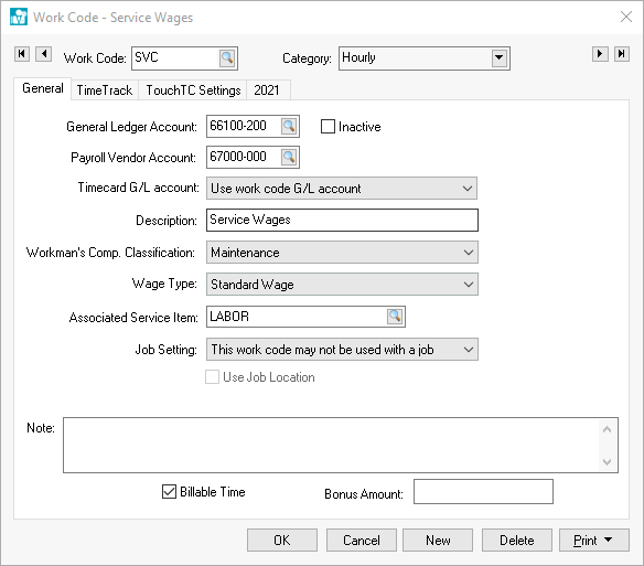 Enter an optional Associated Service Item if the work code labor is being resold. This entry should be kept blank for non-billable labor. This service item is used for reporting purposes.