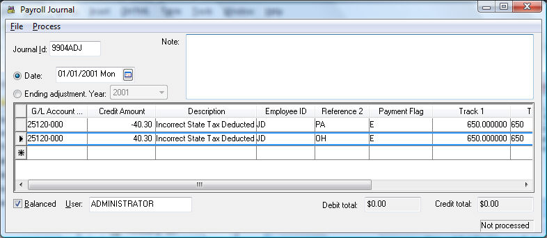 In the example above, an adjustment was needed since the wrong state tax was withheld from JD’s pay. A total of $40.30 was withheld from an employee’s taxable gross pay of $650.00 in the month of January. The first line removes it from the wrong state tax of PA and the second line enters the tax into the tax id – OH. The taxable gross pay and the gross pay are also adjusted within the Track 1 and Track 2 columns. This adjustment will NOT adjust the employee’s taxable gross pay. See previous section for details in adjusting an Adjusting an Employee’s Gross Pay.