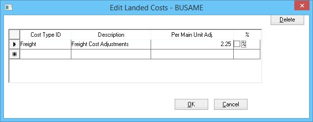 The default landed cost adjustment amount can be set based on a dollar value or a percentage. The Per Main Unit Adjustment value shown above will add $2.25 for each Duct Tape unit purchased from Vendor - BUSAME.