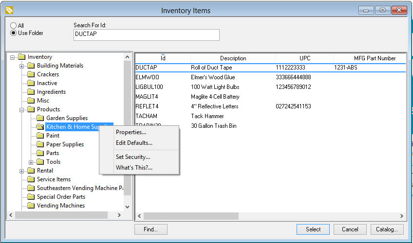 Open an inventory item from the EBMS menu by selecting Inventory > Product Catalog from the main EBMS Menu.