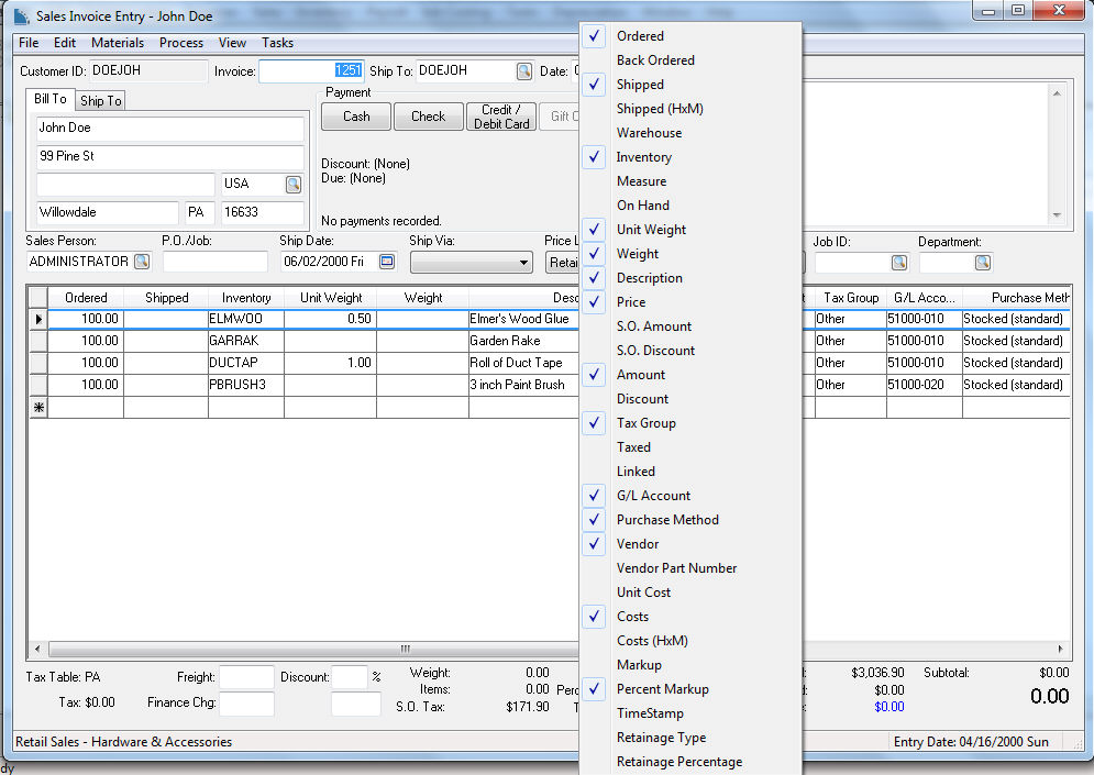 Throughout EBMS, you are given lists of information in a column format. The headings of those columns have flexibility in whether they appear in a window and the width of the column. Note the column headings on the bottom of the invoice below: