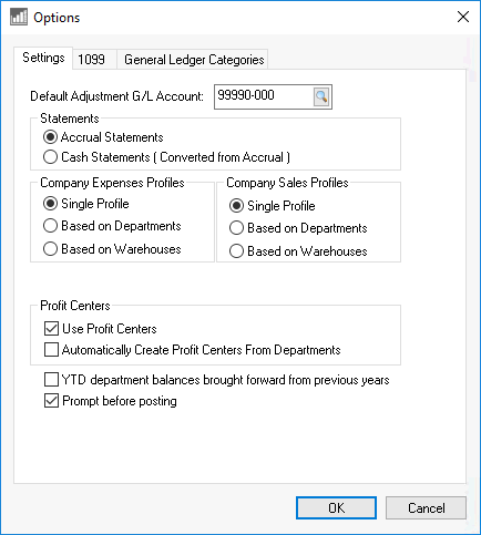 The EBMS software allows the user to configure a company in three ways. Not all options may be available because of System Options. Select the Financials > Options from the main EBMS menu and click on the Settings tab to view the Company Profiles settings as shown below: