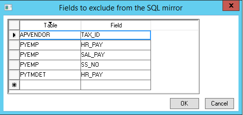 Certain tables may have sensitive information that should not be exported. Choose the table and fields to exclude in the Fields to exclude from the SQL Mirror dialog. Access this dialog by choosing Field List on the File > System Options > SQL Mirror dialog.