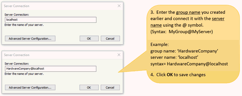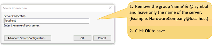 Listing only the name of the server will exclude all company groups. If you wish to include both, do so by listing MyServer,MyGroup@MyServer where the group is separated by a comma. Choose Advanced Server Configuration for more instructions.
