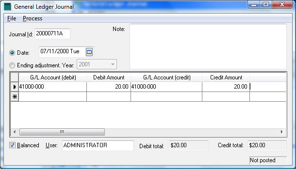 4. Select Process > Post from the journal menu to process the journal or press Ctrl + P on the keyboard.
