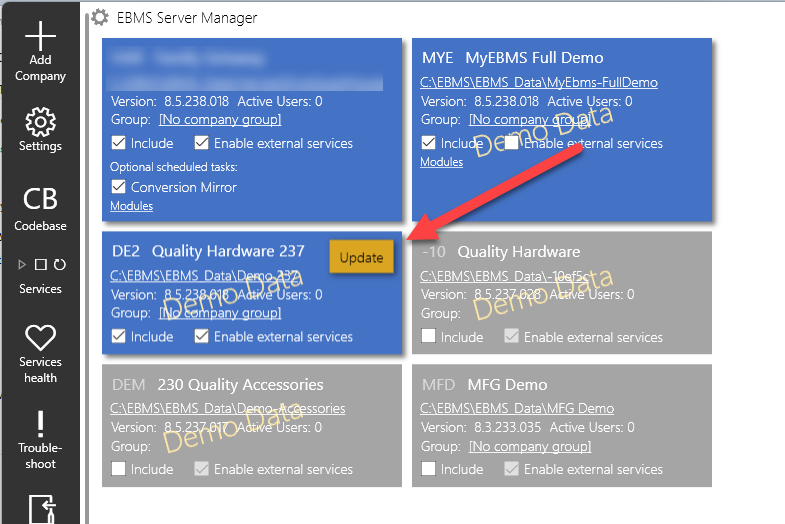Verify that all users have exited EBMS. See Active User count within the data pane.